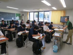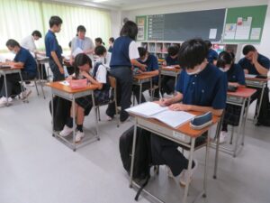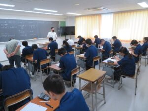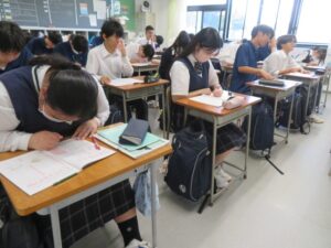 昨日23日は秋分の日で生徒はゆっくりお休みをしたようです。休み明けの本日は通常授業で、生徒も朝から元気に登校をしています。来週から中間試験1週間前となりますので、生徒も真剣に授業を受けています。3年生は大学や専門学校の推薦入試に向けての進路活動が始まりました。書道の授業では、字を1文字1文字丁寧に書くことを意識したり、国語の授業では、自己PRを書く練習が行われ、生徒は進路を意識しながら取り組んでいる様子でした。