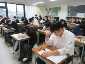 今週の月曜日から気温が下がりはじめ、今日は雨も重なり朝から寒い一日となりましたが、登校した生徒はしっかり授業に取り組んでいました。2,3年生は先週までパソコン向けの検定が続いておりましたが、放課後の補習などにも積極的に参加をして検定試験合格に向け頑張っていました。明日は漢字検定が行われます。申し込んだ生徒は最後まで諦めず頑張ってもらいたいと思います。