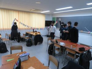 今週末の土曜日、11月1日(土)に行われる生蘭フェスティバル(文化祭)に向け、放課後の文化祭準備が始まりました。そのため、今週の授業は短縮の45分授業となりましたが、生徒は真剣に取り組んでいました。また放課後は各クラスや委員会で集まり、生徒同士が協力しながら取り組んでいる様子でした。
