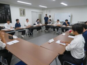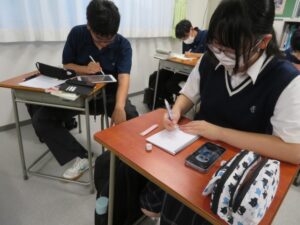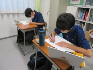 放課後は、部活動や委員会活動、さらに勉強会での自習や進路活動など、生徒は活発活動を行っていました。今日は11部活で活動が行われてたので一部紹介をします。グラウンドでは、ソフトテニス部とサッカー部が練習を行い、校舎前の芝生では陸上競技部が短距離と長距離に分かれ練習に励んでいました。また、美術部では各々が絵を描いて過ごしていました。さらに、本校には委員会の委員長と生徒会役員が話し合う中央委員会があり、その代表生徒は文化祭に向けて活発に意見を交わしていました。明日は保護者向けの学校公開と1・2年生は学級懇談会を予定しております。ご来校いただく予定の保護者のみなさんは、公共交通機関を利用しての来校をお願い致します。