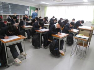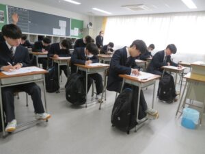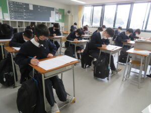 本日から5日間の日程で3学期学年末試験が始まり、初日は3時間の試験が行われました。生徒は土日を使ってしっかり勉強をしてきた様子で、各時間真剣に取り組んでいました。金曜日までの長い日程ではありますが、最後まで諦めず頑張ってもらいたいと願っています。