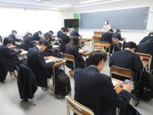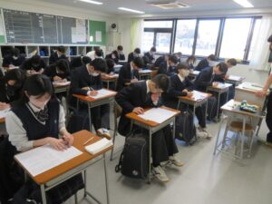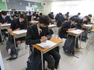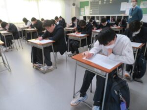 2/3~2/9の日程で、3年生の卒業試験が始まりました。今日は2教科の試験となりましたが、生徒は最後まで諦めることなく取り組んでいるようすでした。また、1・2年生も短い3学期の授業をにしっかり取り組んでいる様子でした。朝晩の冷え込みがまだまだ厳しい季節です。またクラスによってはインフルエンザが流行ってまいりました。こまめな手洗いやうがい、マスクを着用をして感染症の予防に努めてもらいたいと思います。